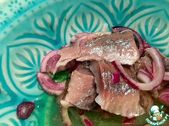 Селедку нарезать на кусочки, приправить растительным маслом и посыпать репчатым луком.