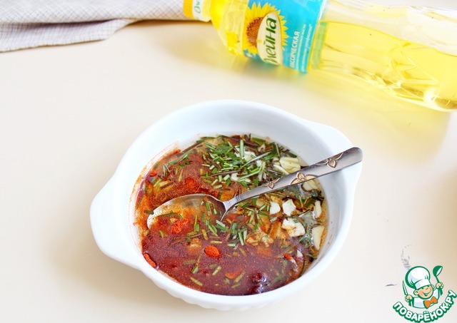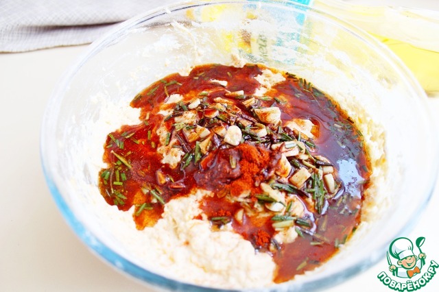 В мисочке смешать нарезанный свежий розмарин (можно заменить на сушеный), паприку молотую сладкую и острую и нарезанный чеснок. Добавить растительное масло "Олейна" и перемешать.