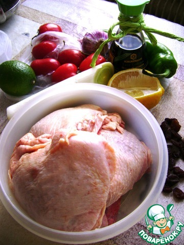 • Куриные бедра-или любимые ваши запчасти –промыть, дощипать и обсушить. Овощи очистить, помыть и нарезать ломтиками и дольками. Изюм промыть, четвертинку лимона разрезать пополам и половинку нарезать тонкими и маленькими кусочками вместе с кожурой.