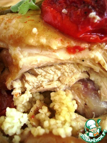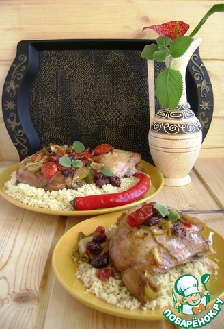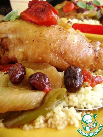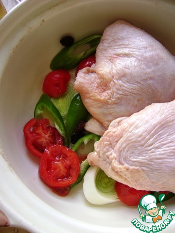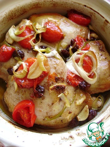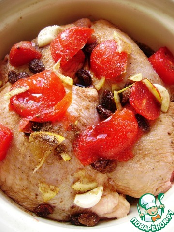 • В толстую форму с крышкой-лучше б керамическую, можно из огнеупорного стекла –выложить ломтики лука-порея, перца и половину помидоров. Посыпать половиной изюма и уложить сверху бедра.