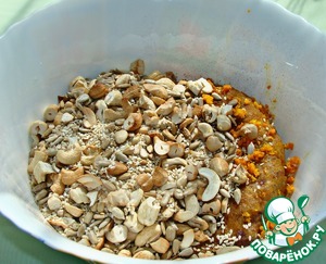 Все орешки и половину нормы кунжута, высыпать на противень и прокалить в духовке до золотистого цвета. Горячие орешки сразу высыпать к финиковой массе. Добавить цедру одного апельсина, корицу, кардамон и все тщательно перемешать.
