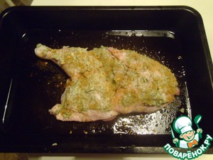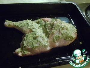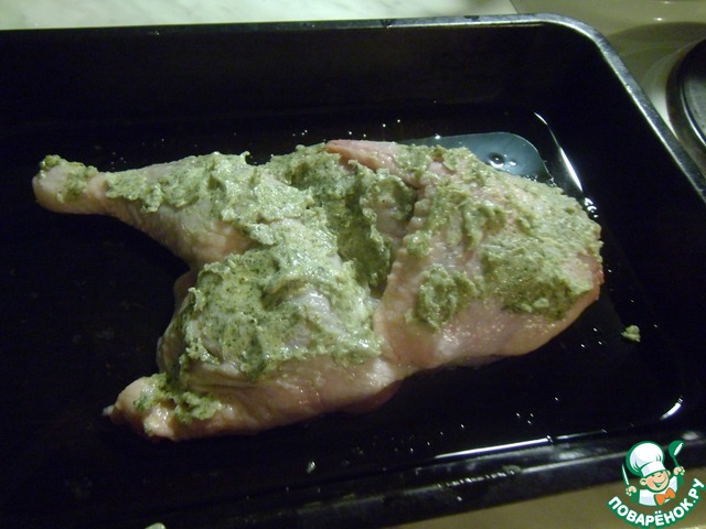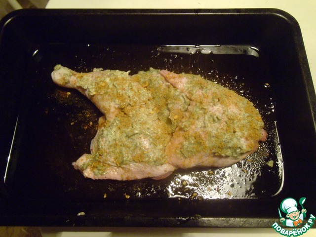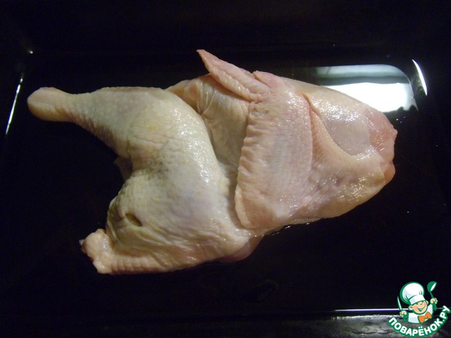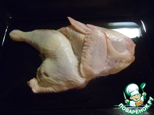 Курицу моем, натираем солью и выкладываем на смазанный растительным маслом противень.