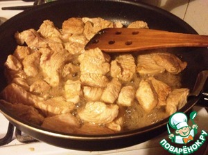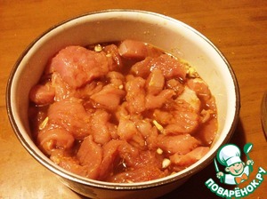 Куриное филе нарезать кусочками, выложить в смесь для маринада и оставить минут на тридцать. -