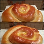 А это моя улитка... Улитища, я бы сказала В начинку, кроме сыра, добавила еще ветчину и помидорчики. Тесто очень вкусное, сырок расплавился, тянется, кислинка от помидора. Вообщем, пирог удался! Спасибо Вам, Алёна, за рецепт!
