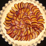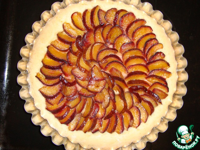 Раскатать тесто и уложить в смазанную форму, сверху разложить кусочки сливы и посыпать измельченными орехами.