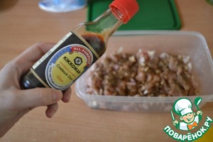 Курицу сложить в герметичный контейнер, добавить лук, чеснок, лимонный сок, кориандр, соль, соевый соус, перец. Перемешать, закрыть крышкой, оставить на пол часа мариноваться.