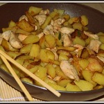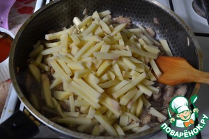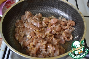 Добавить кусочки курицы, обжарить в течение 5 минут, помешивая.