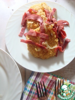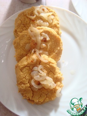 Разложила гороховые лепёшки по тарелкам. На одну тарелку выложила просто лук обжаренный.