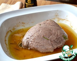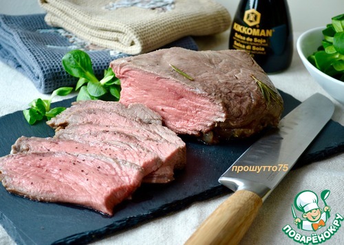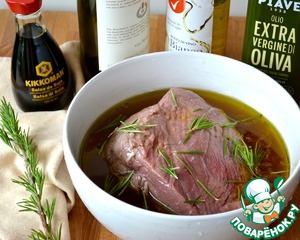 Замариновать кусок говяжьей мякоти минимум на 2 часа в смеси оливкового масла, белого винного уксуса, вина и соевого соуса. Положить черный перец горошком и "иголочки" розмарина. Пару раз перевернуть мясо.