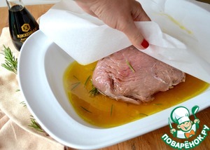 Затем выложить мясо в глубокую жаропрочную форму (или на противень с высокими бортиками). Вылить на мясо часть маринада. И закрыть его сверху большим листом пекарской бумаги.