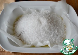 Сверху засыпать крупной солью таким образом, чтобы она полностью накрывала мясо (в качестве "крышки") - горкой, но при этом не была с ним в прямом контакте! То есть между мясом и солью должна быть бумага...