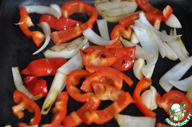 • Порезанные овощи смазываем кисточкой растительным маслом и обжариваем на сковороде-гриль с обеих сторон на большом огне около 2 минут.