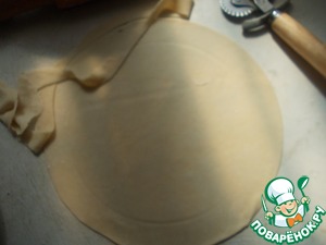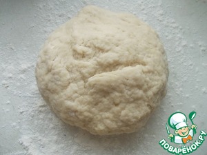 Высыпаем в жидкость муку и начинаем замешивать тесто, оставив около 1 стакана для подсыпания во время раскатки. Тесто не должно быть сильно крутым, но и легко должно раскатыватся. Отправим его в холодильник на пол часика.