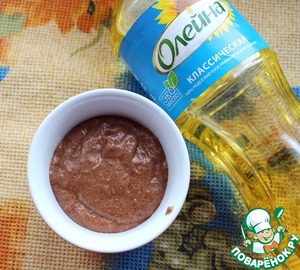 Смешать жидкие ингредиенты: воду и 2 ч. л. масла. Кстати, вместо воды можно взять готовый кофе, тогда из сухих ингредиентов следует исключить растворимый кофе.