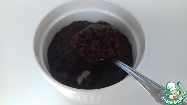 Вмешать сухие ингредиенты и жидкие и тщательно размешать, чтобы не было комочков. Рамекин или кружку смазать подсолнечным маслом и вылить тесто.