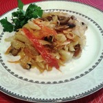 На растительном масле спассеровать мелко порезанный лук и добавить нашинкованную тонкой соломкой капусту.
