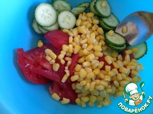Огурцы нарезать кружочком, помидоры полу дольками. Выкладываем кукурузу, предварительно слив лишнюю жидкость.