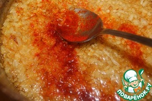 Мелко нарезанный лук тушить в масле до золотистого цвета. Добавить паприку и перемешать.