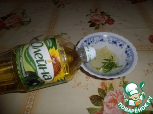 • В чашечку наливаем растительное масло, добавляем чеснок, зелень и душистый перец. Перемешиваем. Заправка готова.