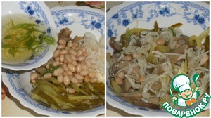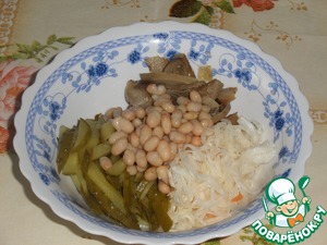 • В чашку выкладываем квашеную капусту, нарезанные грибы и огурцы, консервированную фасоль.