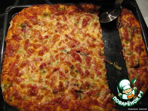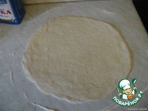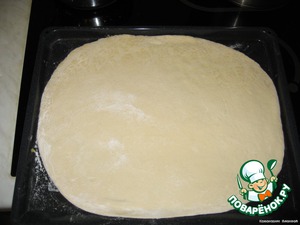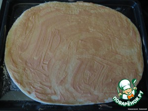 Смазываем поднос растительным маслом, выкладываем на него предварительно растянутое тесто.