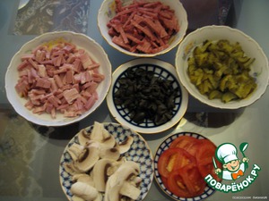Мелко режим ветчину, варено-копченную колбасу, солёные огурцы, томаты, грибы, маслины.