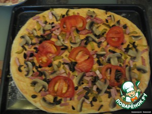 Смазываем тесто смесью томатной пасты, майонеза, черного молотого перца, оливково масла.