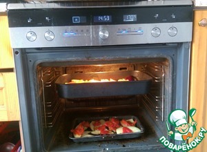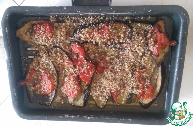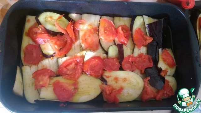 2. Вылить¾ стакана оливкового масла на противень, положить баклажаны, чтобы одна долька накрывала край другой. Порезать тонко помидоры, на каждую дольку баклажана положить дольку помидора, залить оставшимся маслом.
