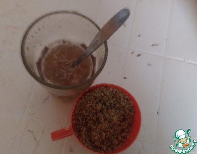 4. Смешать воду с уксусом и потертым на мелкой терке чесноком, измельчить грецкие орехи в ступке или блендере