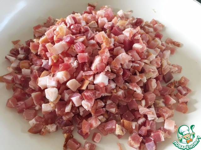 • Получится очень вкусно! Приступим. Бекон нужно нарезать небольшим кубиком.