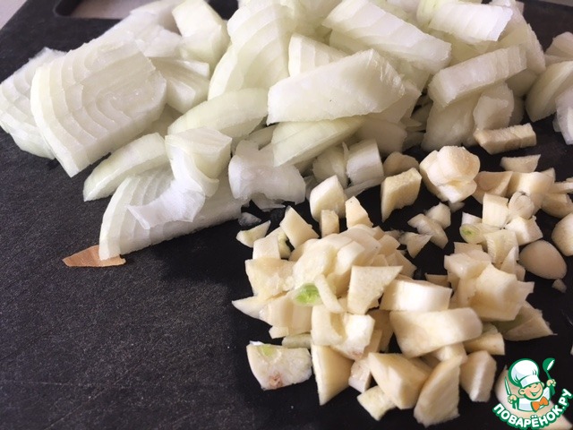 • Обжарите бекон и отложите пока в сторону. На вытопившемся жире поджарьте лук с чесноком.