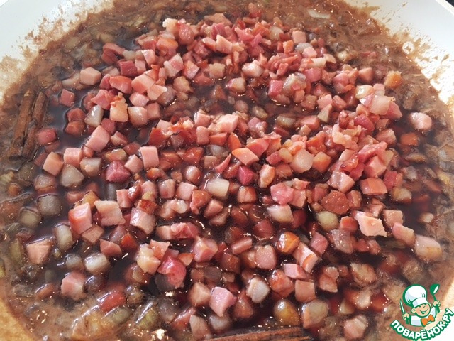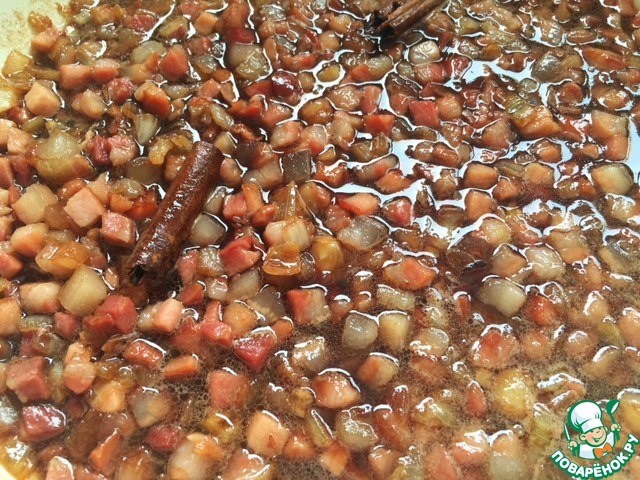 • Добавьте палочку корицы. Слегка убавьте огонь и варите, периодически помешивая, еще 5 минут. Потом всыпьте обратно бекон.