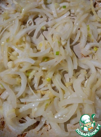 Затем мамуля делает заготовку: лук режет полукольцами, обжаривает на масле до золотистого цвета.