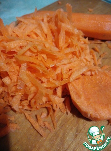 Морковь мама трет на крупной терке и выкладывает обжариваться к золотистому луку.