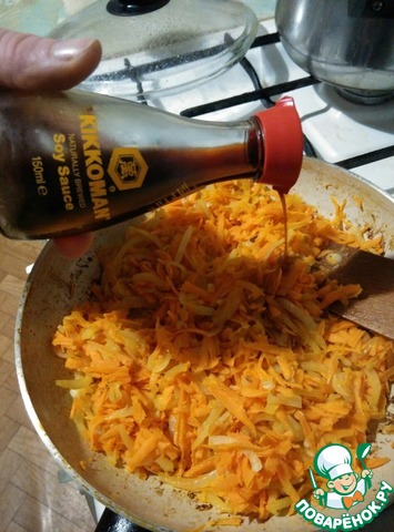 Затем мамочка берет заготовку, пропитанную соевым соусом ТМ "Kikkoman", и раскладывает поверх картошки.