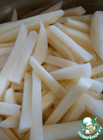 Картофель мамочка моет, чистит, режет соломкой. Растительное масло мамуля разогревает на сковородке, выкладывает в него картошку и жарит ее практически до готовности.