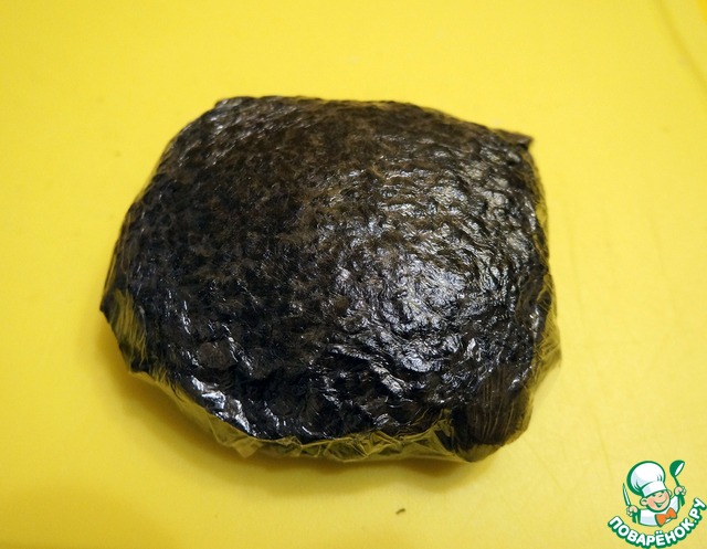 Обматываем онигирадзу пленкой как можно плотнее, стараясь прижать все торчащие уголки листа нори. Если нори начнет ломаться - не беда! Прижимайте все равно, стараясь только закрыть всю начинку.