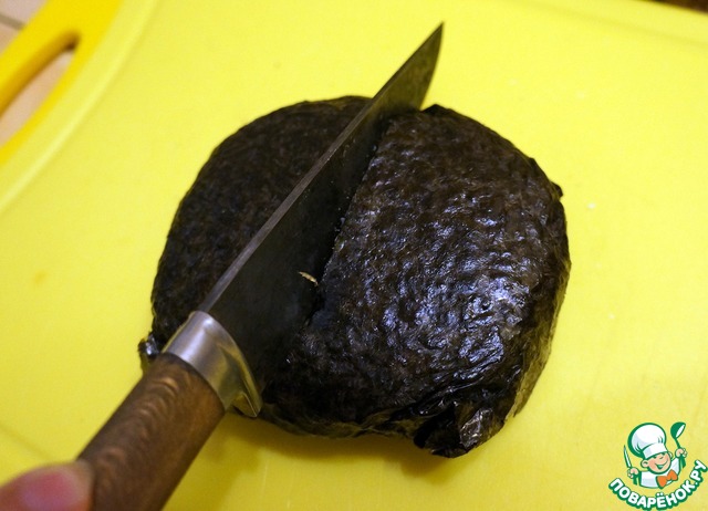 А теперь снимаем пленку и очень острым ножом разрезаем онигирадзу пополам. Режем аккуратно, удостоверяясь, что нижний слой нори мы тоже рассекли и он не пойдет лохмотьями при попытке разъять половинки.