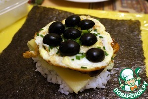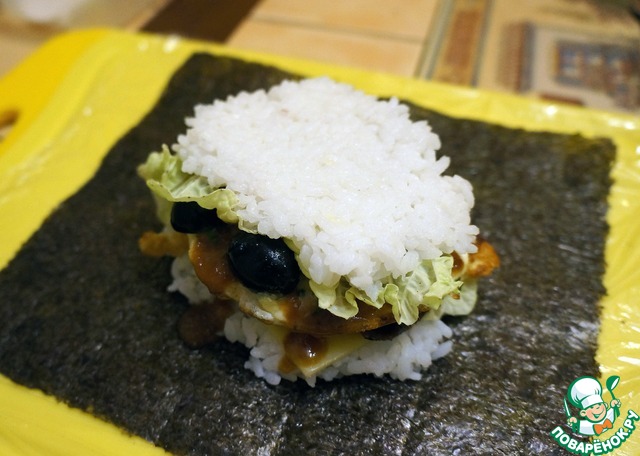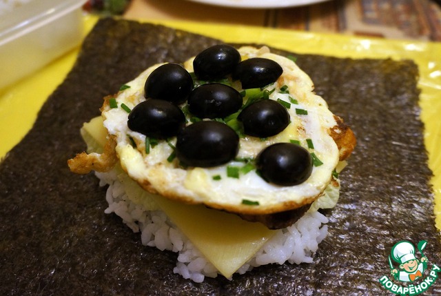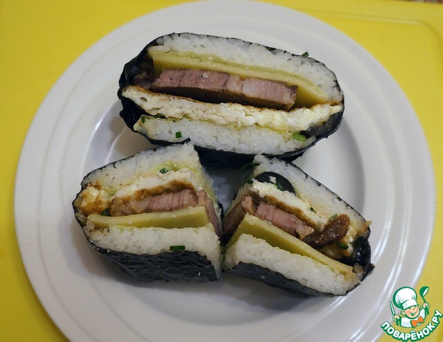 Вот такие замечательные сэндвичи онигирадзу. Тут и рис, и мясо, и яйцо, и овощи, и сыр, и вкусный соус от ТМ Киккоман. Быстро, сытно и полезно.