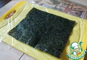 На разделочную доску положим пищевую пленку, а на нее - лист нори гладкой стороной вниз.
