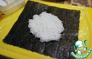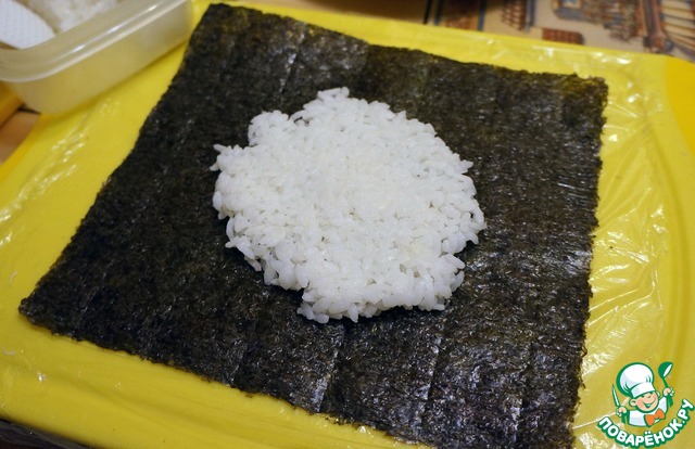На нори выложим половину риса аккуратной лепешечкой, примнем лопаткой, чтобы лежал плотно.