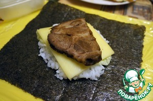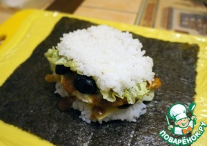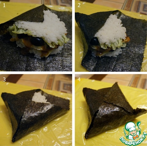 А теперь начинаем заворачивать наш онигирадзу! Не стесняемся придавливать начинку сверху. Даже если она немного расползется - дальше нори все равно не убежит.