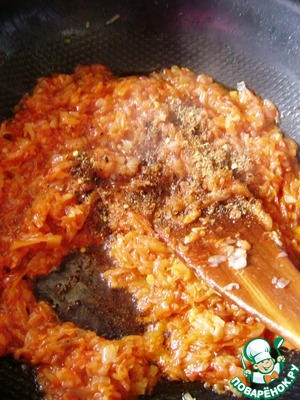 К полуготовому луку добавить томатную пасту и пассеровать вместе, добавив щепотку сахара, посолив и добавив пряную смесь. Остудить и поставить емкость с луком в наклон, чтобы лишнее масло стекало.