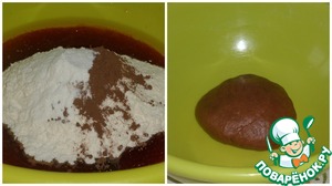 Добавляем просеянную муку, разрыхлитель теста и какао-порошок. Замешиваем тесто.