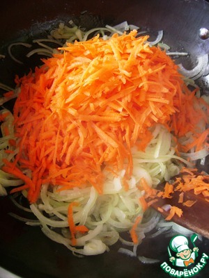 Лук нашинковать тонко, морковь натереть на терке. Обжарить до смягчения и позолоты на масле.