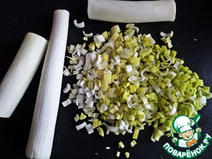 Пока картофель варился, нарезать лук. У меня порей, но это не принципиально, любой можно.