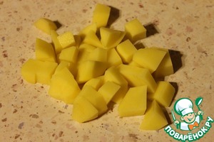 • Картофель нарезать средними кубиками и отправить в бульон.