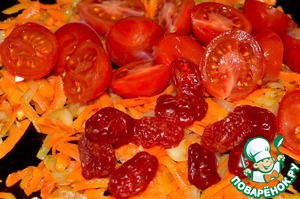 В сковороде разогреть масло и обжарить лук, затем добавить морковь и обжаривать до золотистого цвета. Помидоры черри разрезать пополам и вместе с кизилом и щепоткой куркумы добавить в зажарку, готовить еще 5-7 минут.