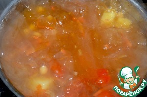 Когда картофель будет почти готов, добавить в кастрюлю всю зажарку, посолить по вкусу. Готовить еще 15-20 минут.