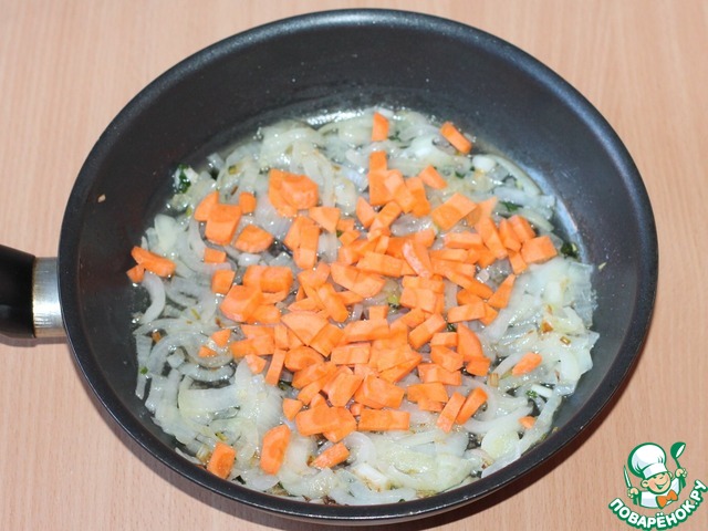 2. В сковороде разогреваем растительное масло и обжариваем мелко порезанный лук до золотистого цвета. К луку добавляем порезанную кубиками морковь и тушим до готовности.